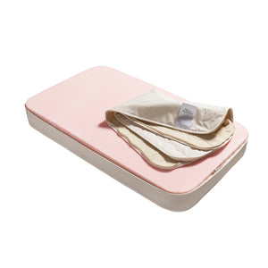 Der Bezug besteht aus GOTS-zertifizierter Bio-Fischgrätbaumwolle, versteppt mit einer Schicht aus Oeko-Tex-zertifiziertem recyceltem PET-Fasern. Das Oberteil ist auf der Innenseite mit einer wasserdichten Schicht aus Oeko-Tex-zertifizierter Baumwolle ausgestattet, die mit TPU-Folie (thermoplastisches Polyurethan) laminiert ist. Ein Label kennzeichnet die wasserdichte Seite.